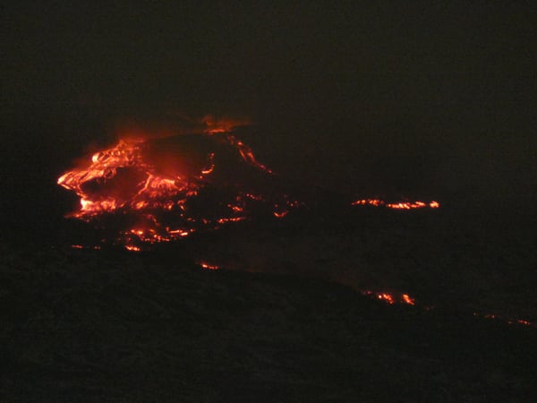 The view is spectacular because from the valley, it looks as if the lava is about to engulf the foothill villages, but this is an illusion. The river of fire spewing from the fracture is far from the towns, though at much lower altitudes than the summit craters. With the naked human eye, when the clouds clear, a large fracture with gushing lava and a copious lava flow descending a very steep slope in a northeasterly direction can be seen.