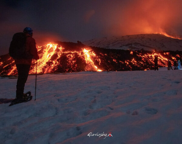 The dangers of going too close to an active lava flow on the snow are linked precisely to the encounter between the very hot fire and the frozen snow. In some deeper points this can cause an immediate (and literally EXPLOSIVE) evaporation of the snow, with the consequent projection of fiery rocks, like bullets, all around. Events like these can surprise even expert people – as happened in 2017 to an expedition of volcanologists injured by a phreato-magmatic explosion.